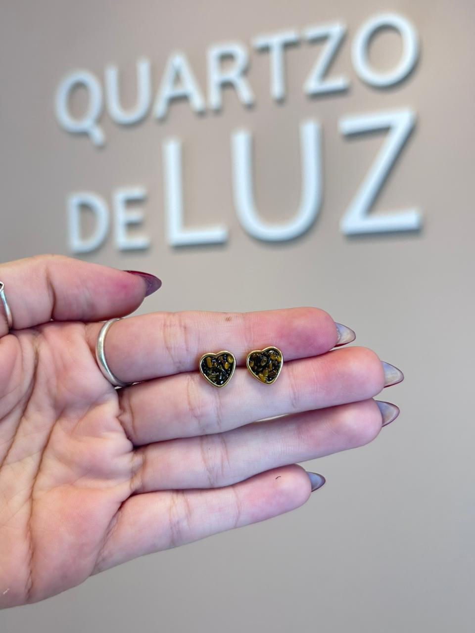 Brinco Coração Mini Fragmentos Olho de Tigre - Proteção e Determinação