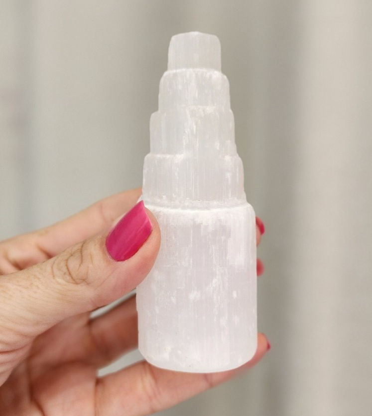 A selenita traz a ligação com a sua luz, traz paz profunda, por isso é ótima pra meditação, pra dormir com ela, pra ter sempre na sua cabeceira da cama. É a pedra de purificação e limpeza energética.