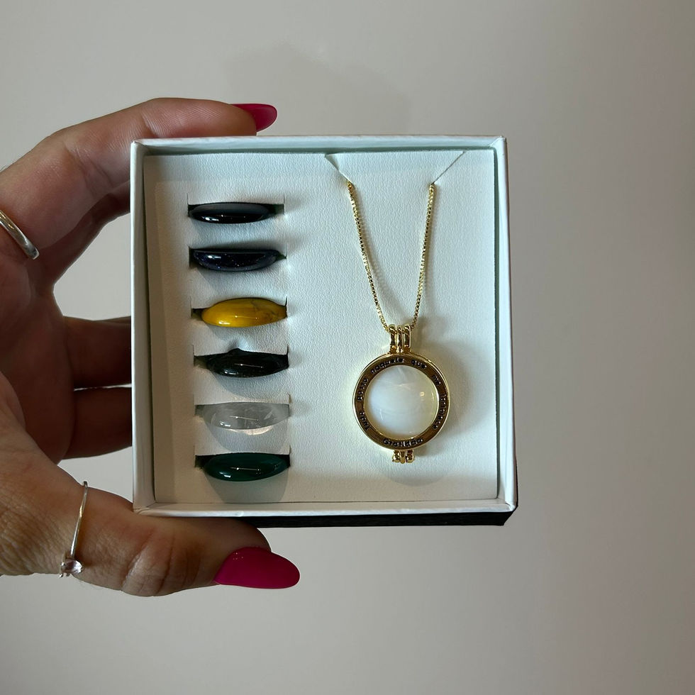 Para complementar sua energia, o colar acompanha 7 cristais intercambiáveis, permitindo que você escolha a pedra ideal para cada momento do seu dia, equilibrando suas emoções e fortalecendo sua conexão espiritual.