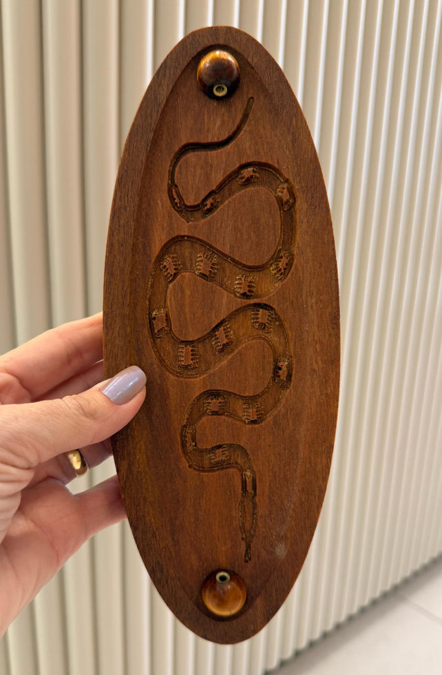 O Incensário Artesanal em Madeira - Gibóia é mais do que uma decoração, é um convite para harmonizar sua energia e elevar sua vibração. Inspirado na fluidez e na transformação, ele auxilia no alinhamento e equilíbrio durante seus momentos de conexão e bem-estar.